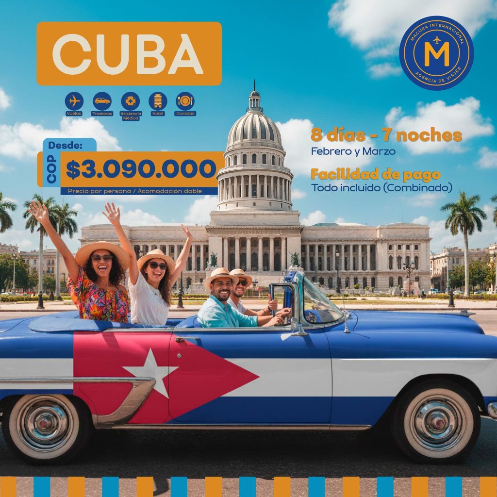 “Disfruta de Varadero y La Habana durante 7 noches, con vuelos ida y regreso, hotel, comidas, traslados y asistencia internacional. Reserva ahora”.
